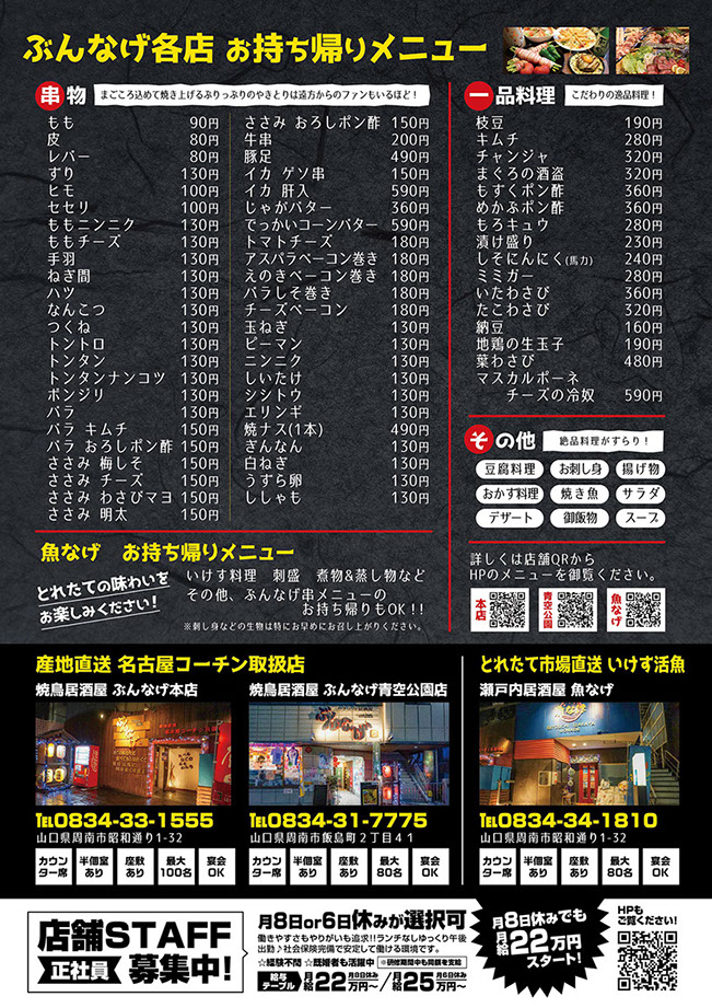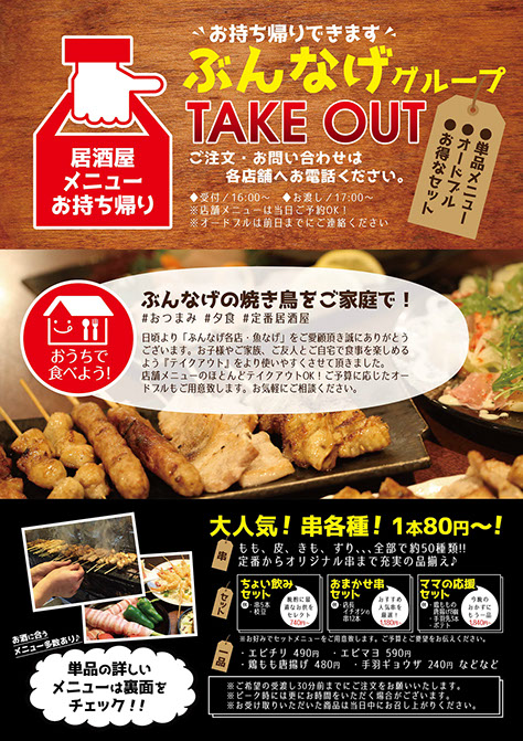 焼き鳥居酒屋ぶんなげ青空公園店ではテイクアウトもご利用いただけます。